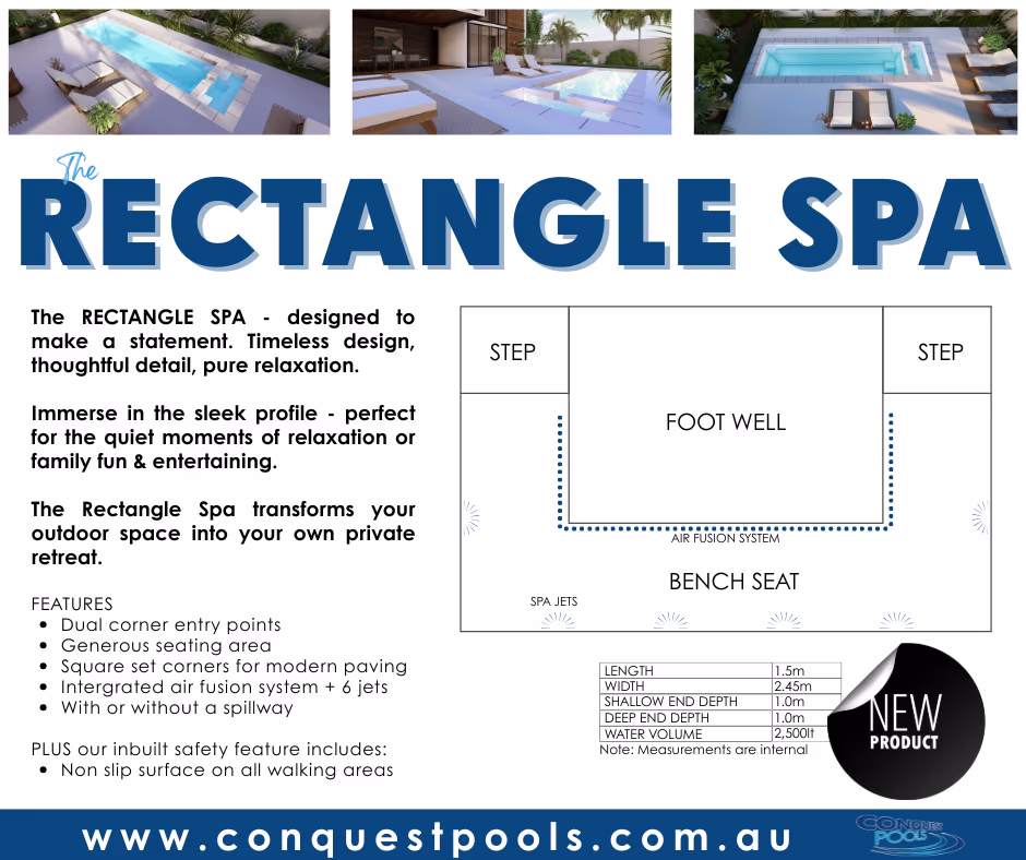Some pools have a fully contained spa as part of the pool, but any spa that we offer can be attached as a standalone using the same filtration system, or it can have a spillover effect into the pool using the same filtration system. Any Conquest Pool can have the “spa effect” which means we can install the spa jets to any of the areas of the pool, without necessarily going to the expense of adding a complete spa. This might be very important if you are space limited. We manufacture this effect into the pool, to have an air blower it would be needed to order prior to manufacture. We do not drill through the core of the fibreglass into an addon airbox. The airbox is manufactured in such a way that the holes drilled into it never communicate with the main structural layers of the fibreglass pools, which means the main pool will never have any chance of getting osmosis, in your Conquest Pools.